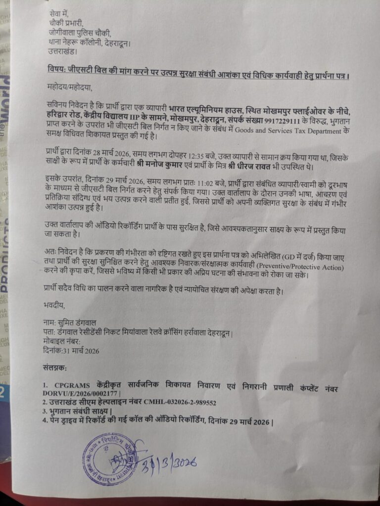 देहरादून। देहरादून में जीएसटी बिल मांगने को लेकर एक व्यापारी और ग्राहक के बीच विवाद का मामला सामने आया है। मामले में शिकायतकर्ता सुमित डंगवाल ने जोगीवाला पुलिस चौकी, थाना नेहरू कॉलोनी में प्रार्थना पत्र देकर अपनी सुरक्षा को लेकर चिंता जताई है। प्राप्त जानकारी के अनुसार, सुमित डंगवाल ने 28 मार्च 2026 को मोखमपुर…